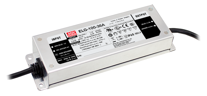 Impulzný zdroj MEAN WELL pre LED aplikácie s krytím IP65 a PFC, výstupné parametre je možné nastaviť pomocou trimrov. Na primárnej strane je vyvedený aj zemniaci žltozelený vodič PE.