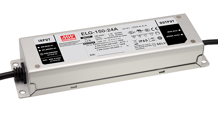 IImpulzný zdroj MEAN WELL pre LED aplikácie s krytím IP65 a PFC, výstupné parametre je možné nastaviť pomocou trimrov.