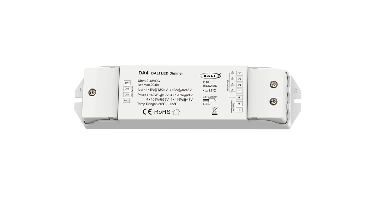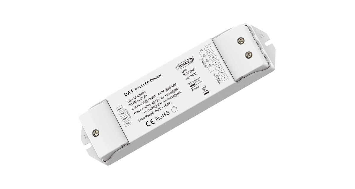 4 DALI adresy, 4 kanály pracujú samostatne.