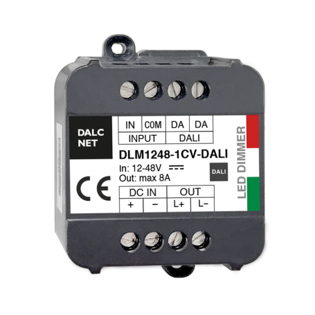 Jednokanálový LED stmievač na báze PWM, vstup konštantného napätia 12-48V DC, výstup 1x6,5A, riadený DALI sigálom alebo analogová automatická detekcia vstupného signálu : tlačítko , 0-10V , 1-10V , potenciometer.