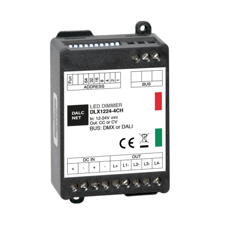 Štvorkanálový LED stmievač, sequencer na báze konštantného prúdu 4x500mA, vstup konštantného napätia 12-24V DC, výstup 4x500mA, riadený signálom DMX.